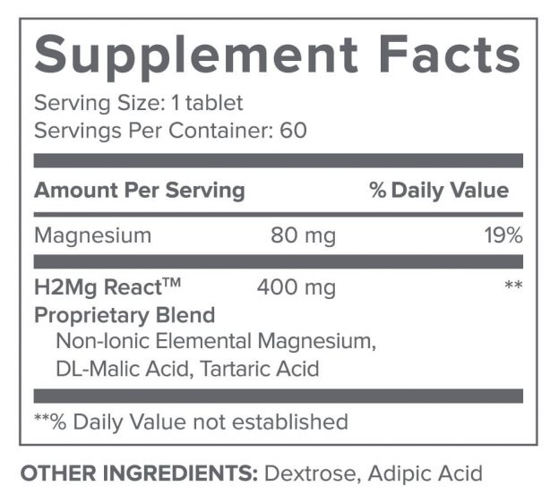 H2 Restore ne contient qu’un seul ingrédient actif: 400 mg d’un mélange exclusif appelé H2Mg React. Ce mélange exclusif contient 80 mg de magnésium, les 320 mg restants étant divisés en une quantité non divulguée entre l’acide DL-malique et l’acide tartrique.